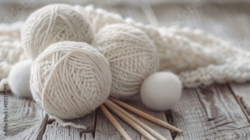Close up of cotton yarn balls and knitting needles on a wooden table