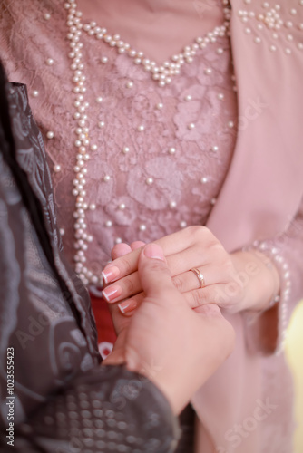 Close up of couple's hands holding each other. Indonesian proposal procession. Illustration of expression of love feelings