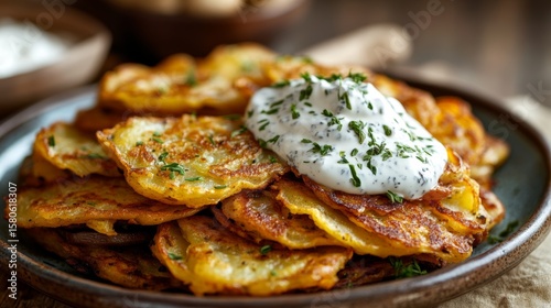 Close up of crispy potato pancakes topped with caramelized onions and herb yogurt on a handmade ceramic plate