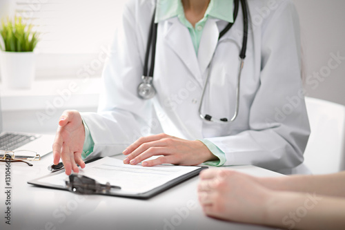 Close up of doctor and patient sitting at the desk near the window in hospital
