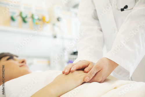 Close up of doctor holding a patients hands lying down on a hospital bed