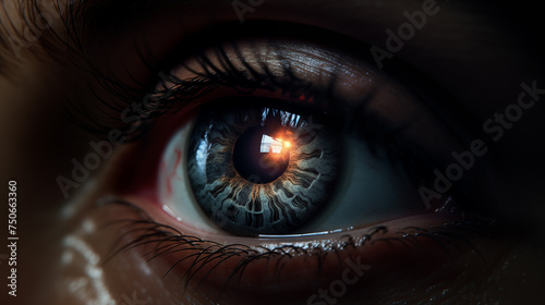 Close up of eye in process of scanning emotions, mirror of the soul, penetrating deep gaze, close-up of the retina