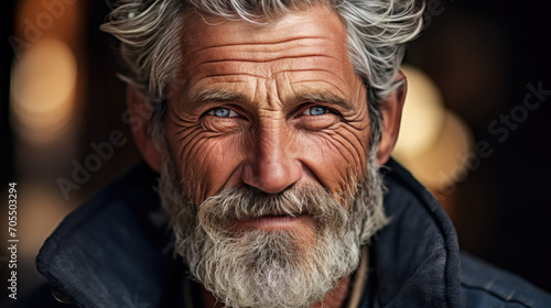 Close up of face old elderly upset unhappy man with a wrinkled face living alone old man looking badass with a bushy white beard