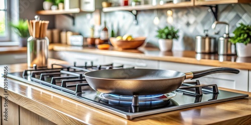 Close up of frying pan heating on gas stove in a modern kitchen , kitchen, cooking, gas stove