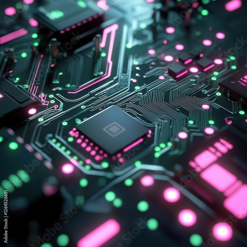 Close up of futuristic microchip with green circuits and pink lights