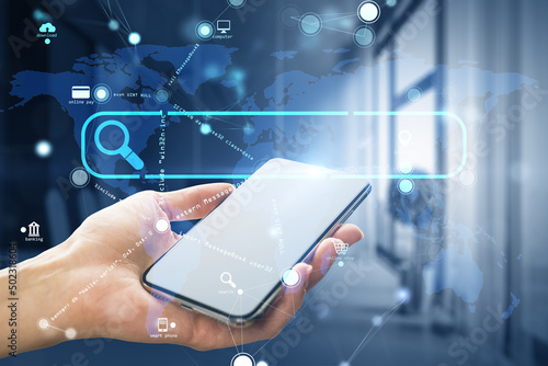 bar, search, banner, address, url, blurry, background, hand, woman, smartphone, computer, concept, international, screen, virtual, map, browser, icon, blue, connection, line, holding, pad, mobile phone, phone, mobile, device, contraption, electronic, office, modern, hologram, contact, closeup, glasses, cellular, close, workplace, website, datum, communication, magnifier, research, buttons, female