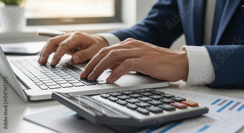 laptop, hand, typing, calculating machine, chart, desk, office, business, finance, accounting, work, computer, technology, keyboard, workspace, businessman, suit, professional, analysis, datum, graph, report, document, paper, table, indoor, corporate, planning, strategy, investment, economy, management, marketing, sale, productivity, efficiency, calculation, financial, statement, inspecting, budget, revenue, growth, success, career, job, employment, occupation, window