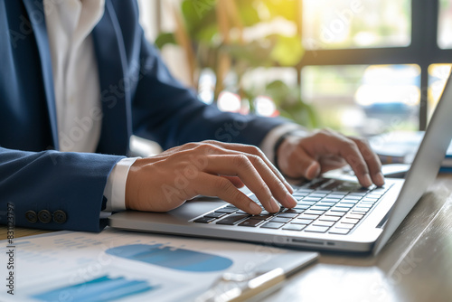 close up of hands typing on laptop in office, business concept