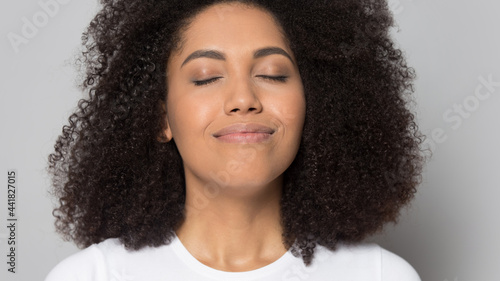 Close up of happy millennial African American woman isolated on grey studio background breathe fresh ventilated conditioned air. Smiling young mixed race female smell good delicious aroma.