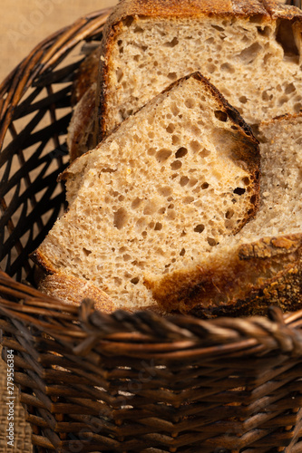 Close up of hearty artisan sourdough bread slices in a bread basket.