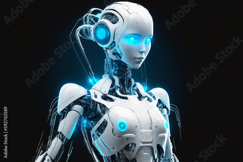 Close up of humanoid cyborg robot with blue eyes powered by futuristic technology and artificial intelligence, AI