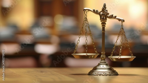 Close up of judicial symbols gavel and scales of justice on a wooden table surface