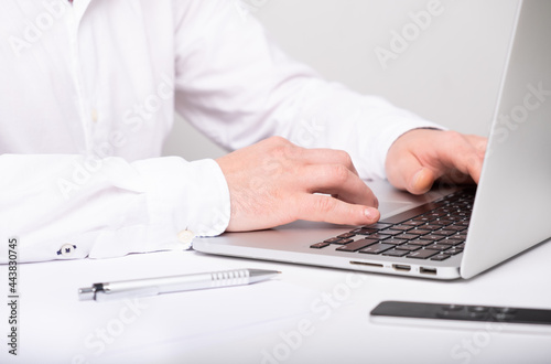 close up of male hands typing on laptop keyboard while working at white desk