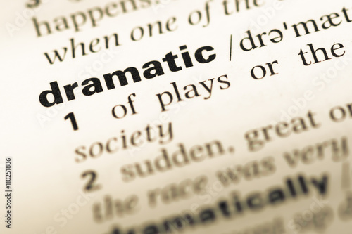 Close up of old English dictionary page with word dramatic