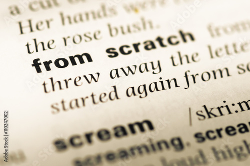 Close up of old English dictionary page with word from scratch