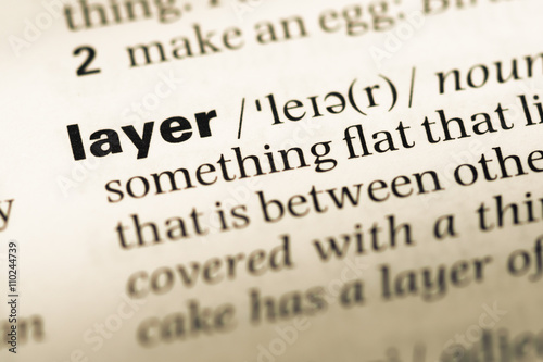 Close up of old English dictionary page with word layer