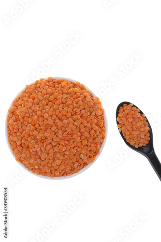 Close up of Orange Masoor Dal (Red Chief) lentil lens isolated on white background with Spoon.