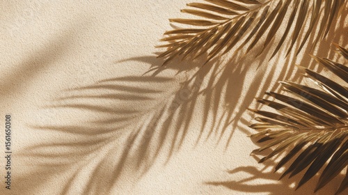 Close up of palm leaves casting shadows on a textured beige wall in warm sunlight.