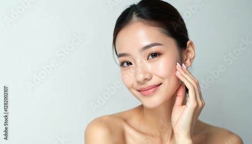Close up of perfect beauty face of young beautiful Asian woman gently touches her face. Facial cream advertising with generative ai. Clean, radiant, hydrated skin care concept for spa and cosmetology.