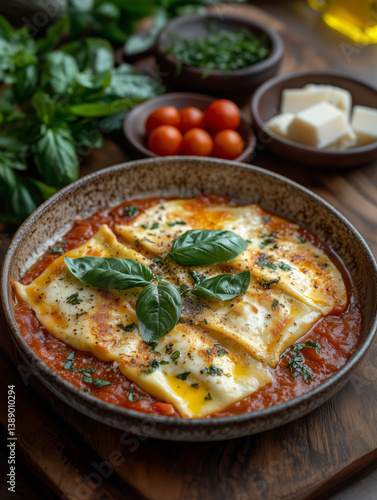 Close Up of Ravioli Pasta in Red Tomato Sauce Garnished with Fresh Basil on Rustic Wooden Table Top Warm Lighting Style