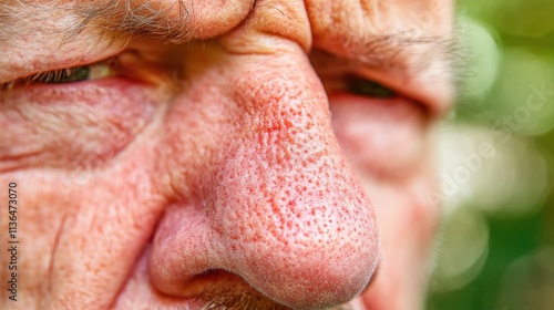 Close up of red irritated nose, emphasizing the discomfort and struggle of allergies or cold symptoms, highlighting the human vulnerability and resilience in the face of common ailments.