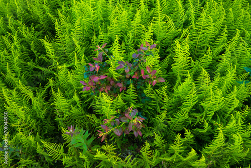 Close up of red leaves among green ferns in Grayson Highlands State Park, Virigina