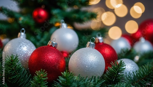 Close up of red, white balls on christmas tree. Bokeh garlands in the background. New Year concept