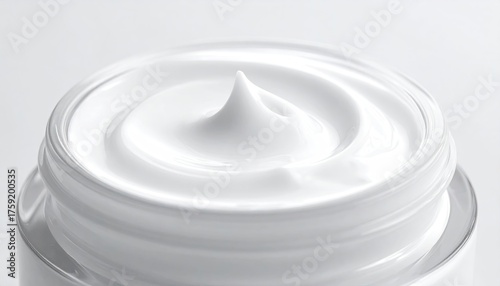 Close up of rich white cream texture swirling inside a clear glass jar with a smooth peak in bright studio lighting perfect for cosmetic and skincare advertising