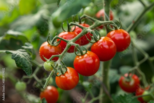 Close up of ripe cherry tomatoes growing on the vine in a greenhouse