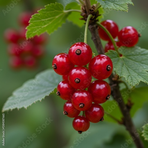 Close up of ripe red currant berries hanging on a branch with green leaves, ready to be harvested, Bright red currants, Closeup of berry cluster, Vibrant green leaves,
