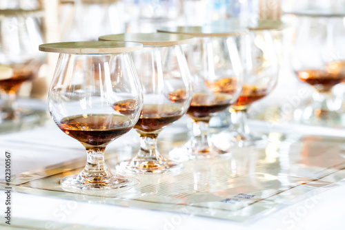 Close up of row transparent drinking glasses with rum on the tasting placemats. Event for connoisseurs of blended old aged strongest liquors