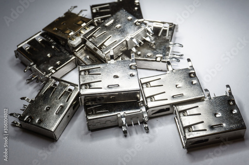 Close up of scattered pile of brass through hole assembly USB socket electronics components on white background in partial focus and random pattern