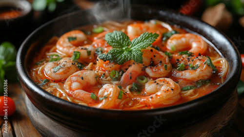 shrimp, prawn, dish, food, seafood, bowl, soup, stew, curry, spicey, hot, meal, cookery, asian, thai, vietnamese, broth, red, orange, green, herb, mint, garnish, fresh, ingredient, cooking, receipe, table, wooden, rustic, close, up, sharpened, foreground, shallow, depth, field, steam, steaming, warm, light, dark, background, horizontal, still, life, nobody, prepared