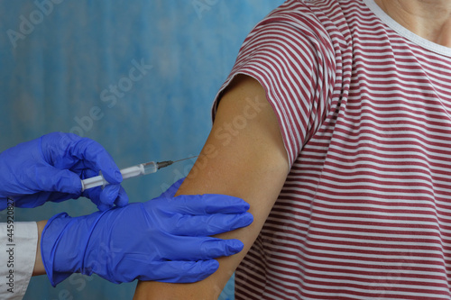 Close up of the hand of a general practitioner holding a vaccine injection. Flu shot. Doctor vaccinates the patient's shoulder