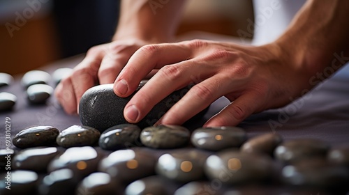Close up of the hands of a therapist applying hot stone