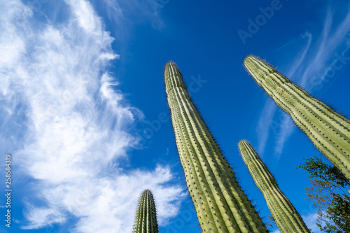 Close up of the organ pipe cactus in Arizona, looking up to a blue sky with clouds, in Organ PIpe National Monument