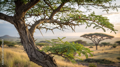 acacia, tree, savanna, landscape, sunset, thorny, green, nature, wilderness, africa, flora, scenic, sunlight, branch, leaf, thorn, environment, tranquil, natural, growth, park, horizon, sky, peaceful, botanical, wild, scenery, vegetation