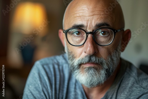 Close up of thoughtful mature man with grey beard and glasses, conveying wisdom and experience