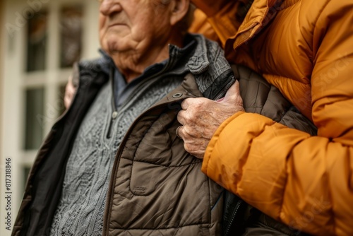 affection, companionship, outdoors, hugs, warmth, closeness, bonding, love, care, comfort, intimate, closeup, elderly, hand, jacket, sweater, texture, fabric, senior, support, friendship, human relationships, togetherness, family, couple, golden years, oneness, hugging, protection, trust, safe, contentment, sharing, generation, winter, casual attire, everyday, clothing, fashion, pattern, style, contemporary