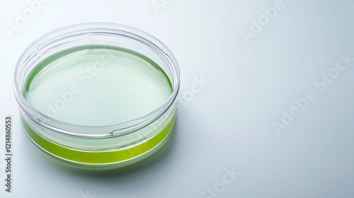 Close up of vibrant petri dish filled with green liquid, showcasing scientific experiment. smooth surface and clear container highlight experiment details