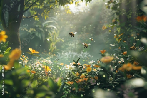 Close Up of Water Stream With Rocks, The gentle hum of bees buzzing among the blooming plant life, bringing the space to life with their gentle presence