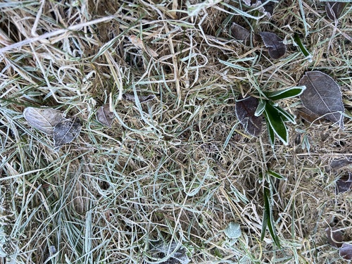 Close up of white coated frost covered green grass garden lawn blades with dried leaves in organic English country garden with early morning light and on crisp cold freezing Winter day flat lay view