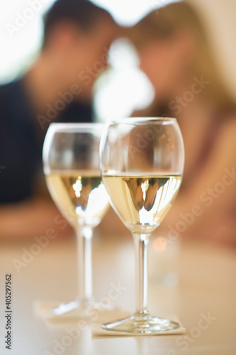 Close up of wine glasses with couple in background