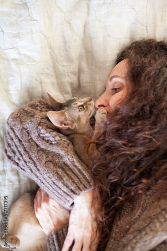 cat, woman, play, home, lay, cosy, bed, hug, vertical, abyssinian, background, beige, between, blue, breed, care, casual attire, closeup, colours, cute, day, domestic, enjoy, face, felino, female, friends, girl, good, grey, happy, hold, joy, kiss, kitten, lifestyle, linen, looking, love, morning, owner, person, pet, pleasure, human relationships, sleep, tenderness, earth