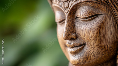 Close up of wooden goddess lakshmi statue face with serene expression for spiritual art