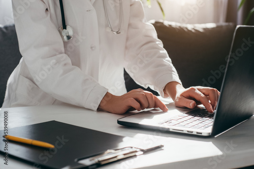 Close up of young woman doctor in white uniform with stethoscope using laptop, writing in medical journal, professional therapist practitioner sitting at table in hospital and typing at computer