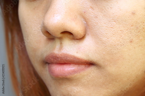 Close up oily face and have problem skin (wide pores) of Asia woman