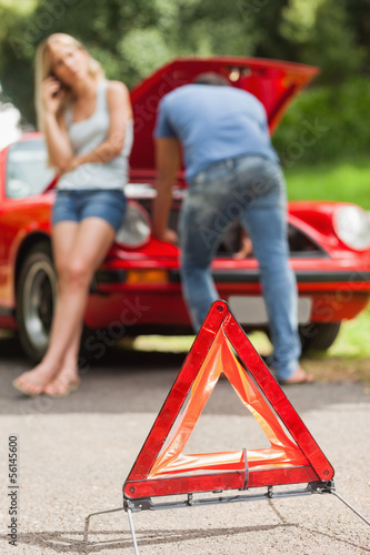 20s, young adult, woman, female, caucasian, man, male, outdoors, nature, countryside, grass, sunlight, clear, sunshine, sunny, summer, spring, cabrio, car, sports car, photogenic, leisure, lifestyle, road trip, vacation, holiday, red, attractive, stylish, cool, crumbled, broken down, hood, bored, fed up, annoyed, irritated, arms crossed, couple, human relationships, together, warning sign, stop sign