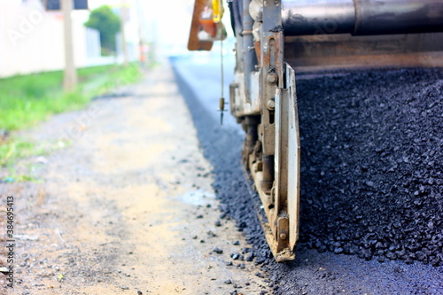 close up part of asphalt paver machine with asphalt stream