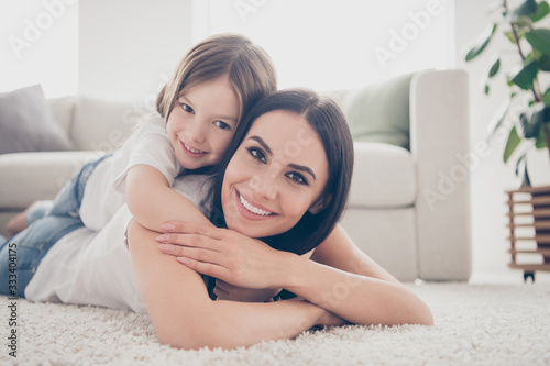Close up photo of cute adorable mom and her daughter have family weekends lay carpet hold small kid piggyback in living room indoors
